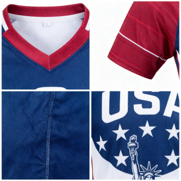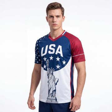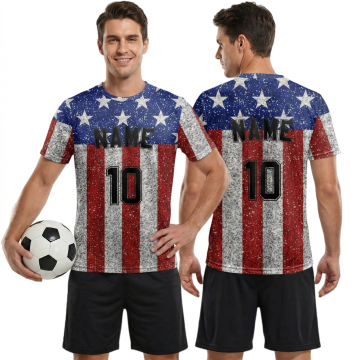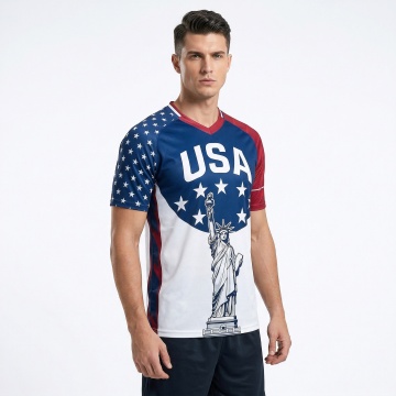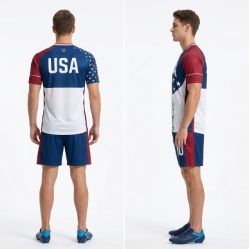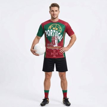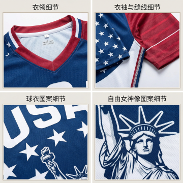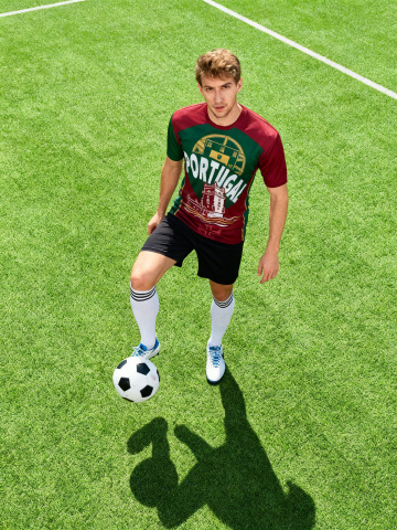 一个欧美帅气白人男模特穿着图片上的足球衣,正面展示,他右手抱着一个黑白相间的足球,左手叉腰,自信看向镜头,高清细节