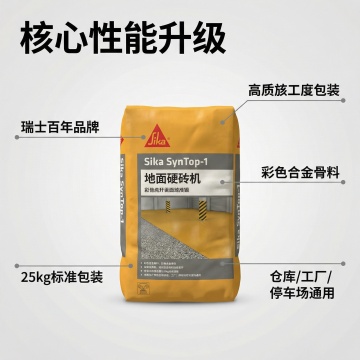 [主图 1] 西卡地面硬化剂建材工业首图,风格为硬核工业风,场景代入。画面主体为多款不同型号的西卡地面硬化剂黄色包装袋整齐摆放在现代化工厂仓库场景中,地面干净整洁,顶部工业灯光照射,呈现专业质感。保持所有产品包装外观和文字与原图一致,产品主体占据画面中心,占比约60%。主色调为产品黄色搭配工业灰背景。采用平视视角,景深适中。文案主标题“西卡 彩色金属骨料干撒式地面硬化剂”,副标题“瑞士技术 高强度耐磨 工业地坪专用”,左上角品牌红标“Sika”,右上角灰色标签“多型号可选”,底部三点亮点“耐腐耐磨 | 工业重载 | 源头供应”,字体均为无衬线粗体,颜色为深灰色,采用悬浮布局,文字不遮挡产品主体,保留安全边距。