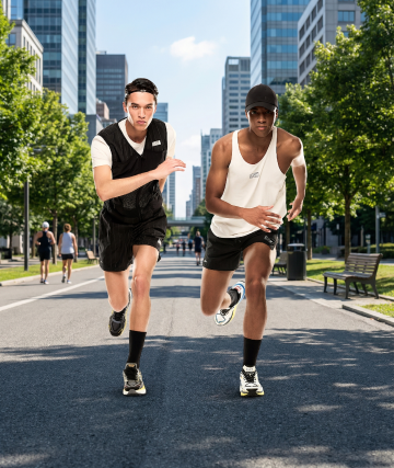 一张充满活力的运动场景照片,展现一位男性运动员在不同运动场景中的动态瞬间。画面采用低角度仰拍,捕捉人物充满力量感的肢体动作和运动姿态。温暖的夕阳从侧后方照射,在人物轮廓边缘形成明亮的金色光晕,同时在地面上投射出长长的影子。天空呈现出清澈的渐变蓝色,点缀着几朵轻盈的白云。人物穿着运动背心和短裤,脚上是专业的运动鞋,肌肉线条在运动中紧绷而富有爆发力。地面根据不同运动场景变化,可能是湿润的柏油跑道、红色的塑胶田径场、绿色的草地或山间小径,表面反射着阳光的光泽。背景可以是城市天际线、郊外的树林或山间的风景,营造出开阔而充满能量的氛围。整体色调以金色、橙色和蓝色为主,高对比度,清晰的细节,展现运动的速度感和力量美,捕捉运动中最具动感和张力的瞬间。