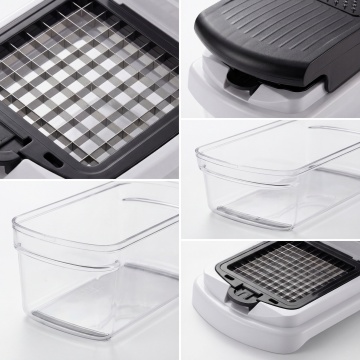 超逼真电商信息图风格图片,展示手动蔬菜切碎器三步使用流程,无任何文字。保持原产品设计不变,黑白配色透明容器。第一格展示将蔬菜块放在刀网格上,第二格展示按下黑色盖子,第三格展示均匀切丁的蔬菜收集在透明容器中。干净白色背景,三个阶段之间有柔和分隔,现代高级厨房产品广告风格,光线和角度保持一致,超逼真产品摄影,干净电商风格,现代美式厨房美学,柔和自然采光,高细节,清晰对焦,真实材质,准确比例,和参考产品设计一致,无Logo,无水印,无额外配件,不变形,产品完整不裁剪,无文字。保持产品主体物理结构不变,透明度控制正确,商业高调摄影,构图平衡清晰。