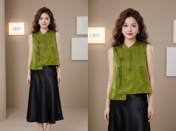 参考图中的服装,生成4K超高清商业带货图文,25岁年轻东亚甜妹,精致五官小鹿眼自然腮红,温柔微笑,棕色大波浪卷发,珍珠耳饰,皮肤白皙通透,小姐姐半身穿着图中的绿色提花无袖马甲搭配黑色缎面半裙套装,展示上半身服装细节,服装细节极致清晰,面料质感真实,版型立体,服装色彩还原精准;背景为现代简约高级室内空间,米白色哑光墙面,带发光字母装饰灯箱和白色艺术画框,极简轻奢装修风格,无杂乱元素;柔光摄影打光,正面补光加侧面轮廓光,写真人像风格,景深效果,色彩柔和高级,发丝服装纹理饰品光泽细节拉满,带货图文风格