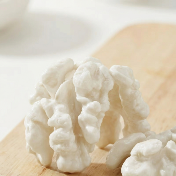 模仿参考图生成一张类似的脱衣鲜核桃仁宣传图,不要和原图一模一样,更换完全不同的真实背景,不要和原背景相似。木盘上的所有核桃仁颜色调整为纯白色。保留原图的文字内容和排版:顶部标题“自然清香 脆甜爽口”,描述文字“采用物理去皮去包衣,清香不油腻 口感跟从树上摘下来的一样”,整体构图和参考图保持一致,尺寸为750x750