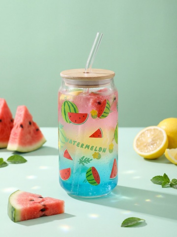 将蓝靛果水果口味饮品瓶身挂满冷凝水珠,旁边放置玻璃杯中加入冰块与水果片,背景改为浅紫到白色的清新渐变,添加自然冷光,让画面清凉通透,新鲜感强,写实风格,突出冰镇爽口卖点,做成电商主图