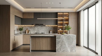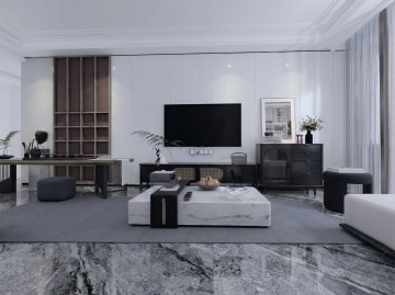 现代感与性冷淡风交融,大理石肌理与金属元素交织,营造清爽质朴的极简空间,玻璃与深色家具平衡视觉,尽显舒适格调。