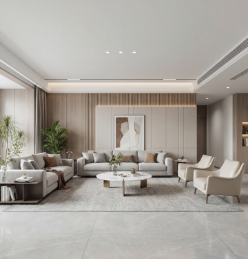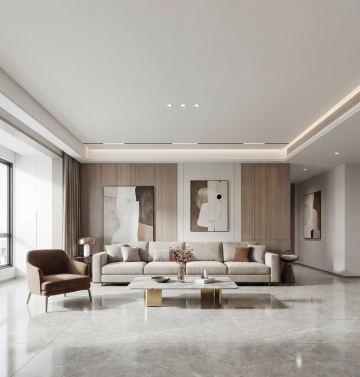 现代感与舒适感交融的3D风客厅,重拟物设计融合木雕与金属元素,光影交错间尽显优雅与商务气质,简约主义贯穿空间,营造静谧都市生活美学。