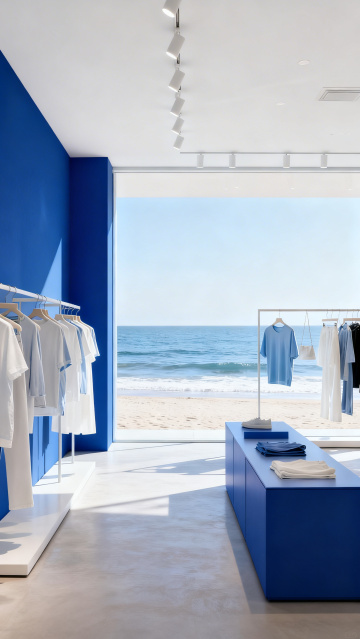 俯视视角,阳光穿透的夏日海滩场景,巨大的立体云朵文字"SUMMER"从碧蓝海水中升起,浪花在字母边缘溅起珍珠般的水珠,三艘载着黄色促销标签的冲浪板从不同角度冲向文字,沙滩上散落着彩色遮阳伞和冰镇饮料杯,远处海平面与渐变蓝的天空相接,整个画面充满动感的波浪线和飞溅的水滴,色调以清爽的天蓝色为主,点缀柠檬黄和珊瑚橙,无任何文字信息。
