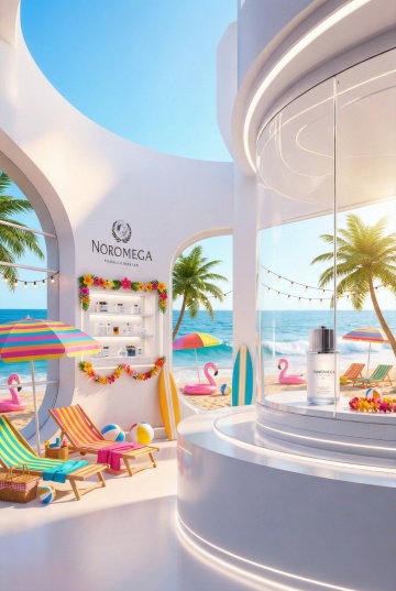 3D渲染风格展台设计,画面中心是一个圆形分层展台,底层为浅木色台阶,上层是白色台面与浅蓝色圆形台面,展台周围环绕着热带绿色植物、粉色充气游泳圈、浅粉色礁石,背景是蔚蓝渐变的大海与白色浪花,上方是晴朗的蓝天与蓬松白云,两侧有翠绿的棕榈叶自然垂落形成框架,整体色调明快清新,充满夏日海滩的轻松氛围,光影明亮柔和,阳光照射下的阴影清晰自然,构图采用中心对称与自然框架结合,突出展台主体。