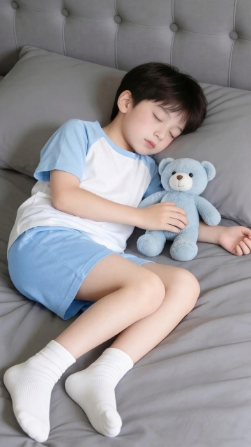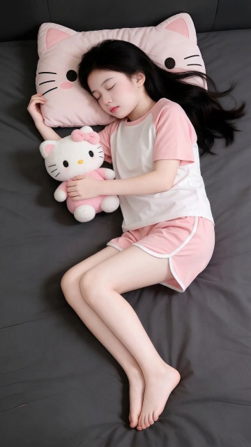 软3D风毛绒场景,卡通动物环绕,动漫风少女躺卧于暖黄毛毯,熊猫睡裤与猫耳发饰增添可爱感,面料质感细腻,营造舒适温馨的居家氛围。