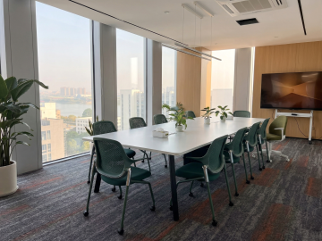 现代简约风格的办公室环境,开放式办公区布局,浅灰色与白色为主的中性色调,大面积落地玻璃窗引入明亮自然光,搭配白色条形吊灯和嵌入式筒灯提供均匀照明,灰色几何图案地毯覆盖地面,白色办公桌配深灰抽屉柜,黑色框架米色坐垫办公椅,办公桌间有半人高白色隔断,角落摆放大型绿植增添生机,金属与玻璃材质的百叶窗隔断,办公桌上配有笔记本电脑和黑色办公电话,整体空间干净整洁、通透开阔,光线充足柔和,营造出专业高效且舒适的工作氛围。