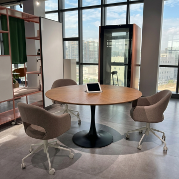 极简主义风格的现代办公室内部,开放式布局,浅灰色地毯,白色墙壁,大面积落地窗引入充足自然光,窗外可见城市天际线,天花板悬挂线性LED灯带与白色吸音板,黑色金属框架办公桌搭配浅色桌面,米白色隔断屏风,黑色人体工学办公椅,桌上配备电脑显示器,绿色盆栽点缀空间,整体色调以灰白、原木色、黑色为主,干净利落的线条,清晰的光影层次,高清晰度,专业办公环境氛围,不同环境(如增加休闲区、会议室入口、前台区域等),不同角度(如从落地窗向外拍摄、从办公桌之间穿行视角、天花板俯视角等)的办公室背景。