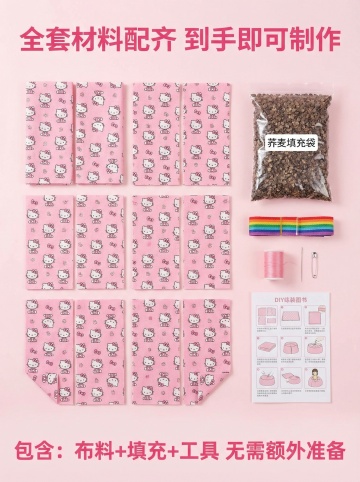 [画面元素] 顶部展示完整材料包套装,下方使用放大镜效果放大展示天然荞麦填充颗粒和Hello Kitty印花布料纹理,清晰呈现材质细节,背景为干净浅粉色