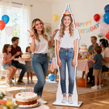 等身人形立牌,微笑的小女孩,白色蕾丝泡泡袖上衣+红白格纹七分裤+粉色布鞋,头戴派对尖顶帽,手持蓝色气球,姿态活泼叉腰。背景是儿童生日派对场景:一群穿粉色连衣裙、戴派对帽的孩子围在生日蛋糕和纸杯蛋糕旁,场景装饰有彩色气球、"HAPPY BIRTHDAY"字母彩旗和流苏拉帘,暖光明亮,高饱和活泼色彩,商业产品摄影风格,主体清晰突出,适合电商展示