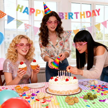 喜庆感十足的儿童生日派对,卡通风格与实景结合,轻拟物风装饰搭配拼贴元素,梦幻清新,充满欢乐氛围。