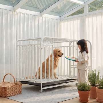保持白色不锈钢狗笼物理结构绝对不变,狗笼放置在ins风走廊的浅米色微水泥地面上,狗笼里面坐着一只金毛犬,一个东亚面孔的小女孩站在狗笼旁边和狗招手互动,整体氛围是家庭小清新简约风格,全屋漫射柔光,低对比度,阴影极淡柔和,画面明亮干净,色调为低饱和度奶油色系,背景是白色墙面挂着几幅组合装饰画,尽头是玻璃房门,柔和自然光,商业实景摄影,4K超清,通透干净。