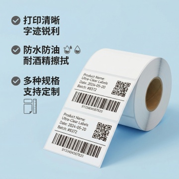 拼多多商品详情图,第五张,展示铜版纸不干胶标签纸整体服务优势,简约风格,包含文案"工厂直销 现货速发,支持定制免费开票,多种尺寸可选",展示整箱商品包装,干净商务背景,整体设计简约大方突出促销信息,适配拼多多平台
