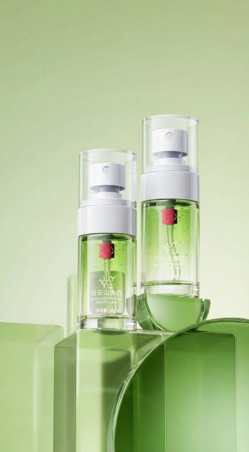 极简几何构图,单色设计风搭配玻璃质感瓶身,呈现现代科技与清透柔和的视觉体验,性冷淡风美学传递舒适宁静之感。