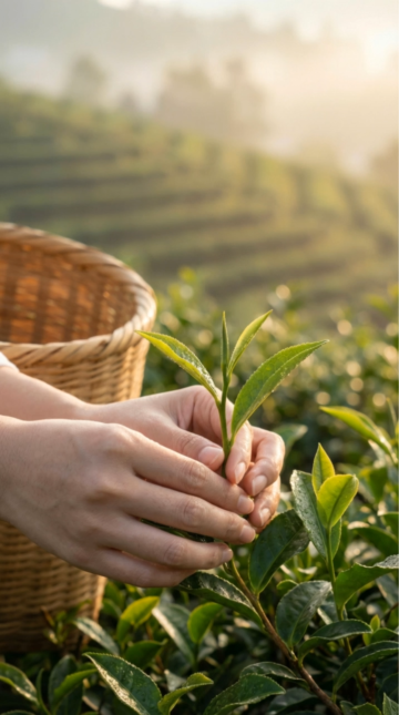 写实摄影风格,嫩绿与深绿渐变的茶园景观,近景为清晰的茶叶特写,叶片纹理分明,带有清晨柔和的侧逆光效果,阳光透过叶片形成半透明的光影质感,背景为层层叠叠的梯田式茶园,延伸至远处的绿色山坡,整体色调清新自然,光线明亮偏暖,构图采用近景对焦、背景虚化的浅景深处理,展现茶园的生机与层次感,氛围宁静而富有自然活力。