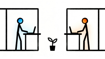 卡通感插画风,大字“WORK”环绕办公场景,色彩鲜明,创意生动。
