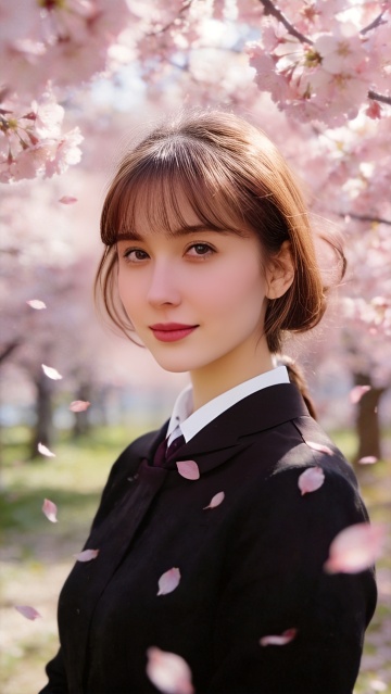 一位年轻女子的上半身特写,她有着棕色的长直发,刘海整齐地垂在额前,发丝被风吹起,显得轻盈飘逸。她穿着一件浅色的针织开衫,内搭白色的衣服,嘴角微微上扬,眼神温柔而清澈,带着一丝腼腆的微笑。她的右手轻轻搭在开衫的肩带上,姿态自然放松。背景是一片盛开的樱花树,粉色的樱花层层叠叠,绚烂夺目,阳光透过花瓣洒下,形成斑驳的光影效果,整个画面充满了春日的浪漫与温馨。照片采用了柔和的自然光,光线明亮而不刺眼,色彩饱和度适中,色调温暖。浅景深效果突出了人物主体,背景的樱花被虚化,呈现出朦胧的美感。整体风格清新自然,充满了少女的甜美与纯真。