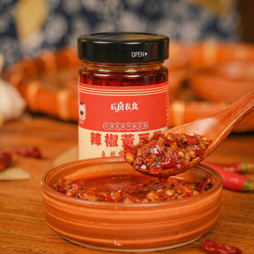 生成类似风格的辣椒黄豆酱美食商业图,保持酱产品和包装本体完全不变,包装形状、结构、图案、文字均不修改,保留酱料原有颜色、颗粒大小、酱豆形态、稠度、光泽不修改,构图类似原图,更换为和之前所有生成结果都不同的背景和道具布置,保持暖色调自然光,柔和侧光,红油油润反光,辣椒鲜亮,微距特写,浅景深,浓郁酱香,干净高级,美食商业摄影质感,超有食欲