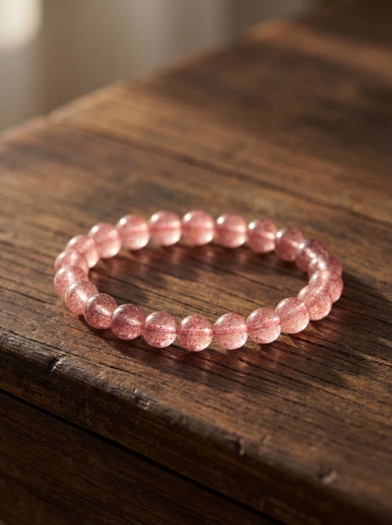柔和光影下的粉晶手串,置于古朴木纹之上,清透质感与木质温润交织,营造出静谧优雅的文艺氛围。