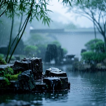 竖版构图,水墨晕染的青灰色迷雾竹林,晨雾如轻纱般缠绕着挺拔的翠竹,月光从竹叶缝隙中渗出清冷的银蓝色光束。前景是湿润的青石板路,苔藓点缀的石板上有半月形水洼,倒映着上方摇曳的竹影与破碎的月光。中景几棵老竹苍劲挺拔,竹节处墨色浓淡变化自然,右侧丛生的蕨类植物以淡绿渲染,远处竹林在雾气中渐变为朦胧的灰紫色轮廓。整体氛围空灵幽静,笔触保留水墨特有的飞白与渗透质感,色调以靛青、石绿与墨黑为主,月光区域泛着冷银色微光,营造出"空山新雨后"的东方禅意空间。