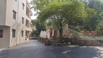 基于原图的不锈钢门,生成农村自建房入户场景无字图,不添加任何文字,保持原不锈钢门样式不变,场景为农村自建房带院子的入户门,外墙贴浅米色瓷砖,水泥地面,自然户外日光,真实乡村风格,无任何文字