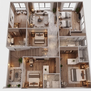 现代感与温馨感交融的3D立体户型图,采用重拟物风与简约主义设计,木雕风纹理搭配石刻风细节,营造舒适宜居空间。