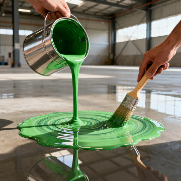将海报顶部大字'水性环氧地坪漆'修改为'水性地坪漆',保持其他内容、排版、配色和风格完全不变,保留下方黄色标语'承接地坪漆产品工程一站式服务厂家'和绿色小字'厂房、车间、车库、家用室内优质之选',以及地下车库绿色地坪图片