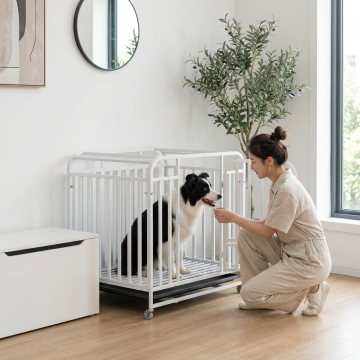 类似参考图片,一位女士在入户玄关和白色狗笼里的边牧互动,简约干净风格,保留白色狗笼产品主体,更换不同场景、不同女士人物、不同品种狗狗,图片比例1:1