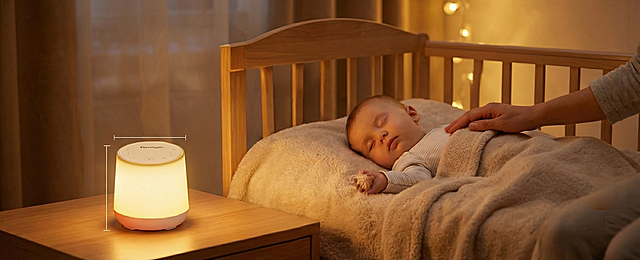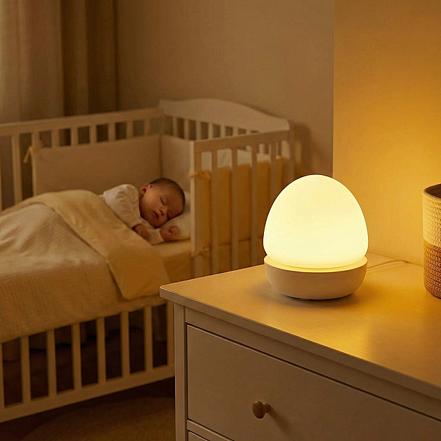 卧室母婴场景,主体是米白色球形插电小夜灯插入墙面插座,发出柔和暖白光,灯体侧面带有感应标识。画面右侧,一位穿着丝绸睡衣的家长正抱着熟睡幼儿。前景木质桌面上,摆放着婴儿奶粉罐与带吸管的学饮杯。构图采用近景平视,焦点集中在灯具上;色彩以暖黄灯光为主调,搭配原木色家具与柔和的浅米色背景,整体氛围温馨治愈。画面风格为写实类母婴产品宣传摄影,质感清晰细腻,突出小夜灯的便捷与护眼功能,营造安全舒适的夜间哄睡氛围。详情
