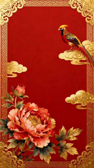 鎏金工笔风骏马,融合牡丹花饰与浮雕质感,古典中式奢华,唯美优雅,描边细腻,尽显东方韵味。