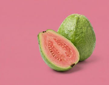新鲜诱人的番石榴果实,摆放在木质桌面,暖光自然氛围,清晰质感,果肉粉嫩饱满,表皮带有清晰纹理,背景虚化突出主体,清新自然的生鲜水果画面