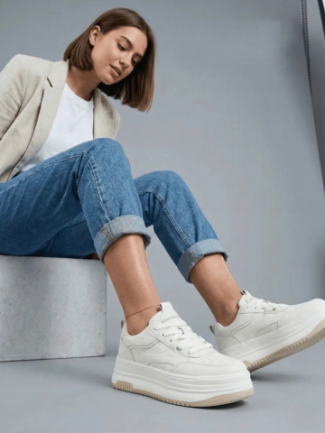 美女模特上脚实拍图,只拍腿部中景镜头,凸出鞋子,显腿长显瘦。模特搭配浅色牛仔半身裙,穿着这双米白色头层牛皮休闲板鞋,保留原图牛皮皮纹质感,保留鞋子原色,鞋子为纯色没有拼色,保持原有鞋子Logo和结构不变。高清真实的电商详情图,淘宝天猫平台风格,时尚种草氛围感,东亚模特,自然坐姿,商业高调摄影,柔和漫射光,低饱和度浅色系背景,画面干净通透,凸显鞋子质感。负向提示词:西方面孔、金发、深眼窝、雀斑、杂乱房间、死黑阴影、硬光、高对比度、鞋子变形、Logo扭曲、文字错乱