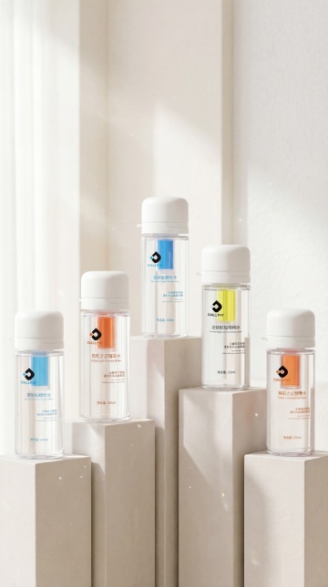 极简主义风格护肤品包装盒,白色主体搭配蓝色字体“SMART MAGIC”,置于浅蓝色渐变背景中,周围环绕大小不一的透明玻璃球体,球体表面有柔和反光与清晰阴影,光线从顶部偏左照射形成立体感,整体氛围纯净、科技感、高端,无任何文字内容,仅保留产品盒与玻璃球元素,构图采用居中偏左布局,留白充足,具有现代产品摄影的细腻质感与柔和光影效果。