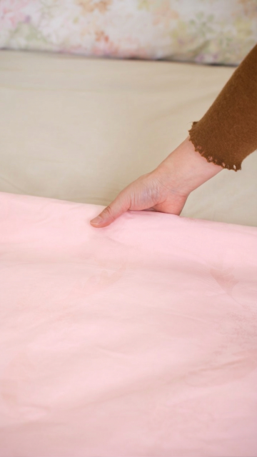 实景感与舒适感交织,柔和光线下的单色床品展现质朴面料纹理,手部细节传递温暖触感,简约设计风营造宁静家居氛围。