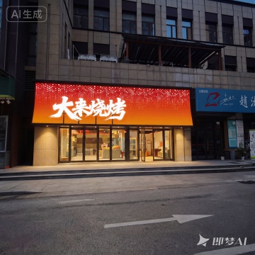 赛博朋克风霓虹灯招牌,未来感十足,夜景中闪烁着科技与美食的光芒。
