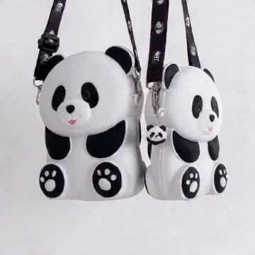 可爱熊猫造型软3D硅胶包,双色设计搭配卡通元素,塑料质感萌趣十足,适合节日礼品定制。