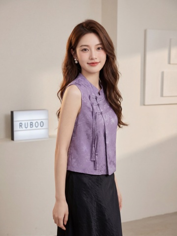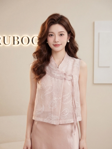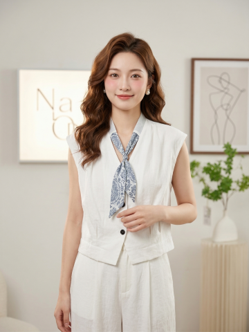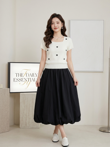 参考图中的服装,生成4K超高清商业带货图文,25岁年轻东亚甜妹,精致五官小鹿眼自然腮红,温柔微笑,棕色大波浪卷发,珍珠耳饰,皮肤白皙通透,小姐姐半身穿着图中的米白色方领爱心针织短袖搭配黑色花苞半身裙套装,展示上半身服装细节,服装细节极致清晰,面料质感真实,版型立体,服装色彩还原精准;背景为现代简约高级室内空间,米白色哑光墙面,带发光字母装饰灯箱和白色艺术画框,极简轻奢装修风格,无杂乱元素;柔光摄影打光,正面补光加侧面轮廓光,写真人像风格,景深效果,色彩柔和高级,发丝服装纹理饰品光泽细节拉满,带货图文风格