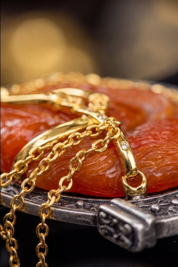 黄金吊坠产品为主体,在一块乌木上,周围放着很多金色枫叶,远处是热带雨林和树的粗支,背景模糊,整体氛围暗色神秘