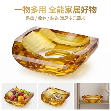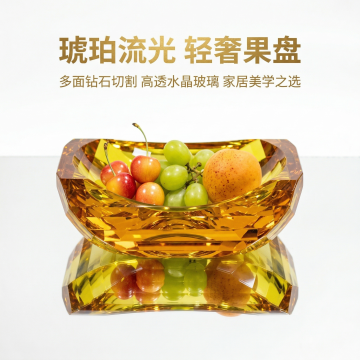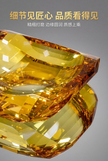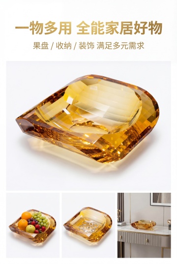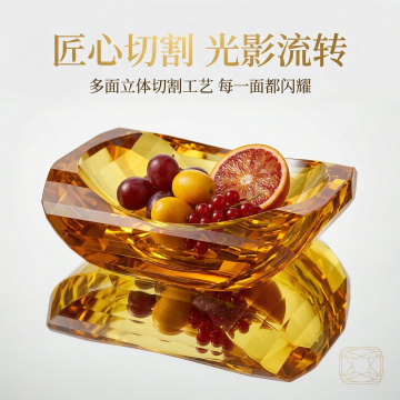 严格还原参考图的琥珀色多面切割水晶果盘,保留颜色、切割工艺、造型、通透质感所有细节。2:3竖版上下分栏杂志排版,上半部分占比60%放置产品切割面特写,下半部分放置极简钻石切割工艺图解,用几何线条标注切割面、棱线、折射原理,图解文字标注清晰格式统一。顶部居中放置大号无衬线烫金字体主标题“钻石切割工艺 匠心打造”,主标题下方居中放置小号同字体副标题“多面立体切割 打造璀璨光影”。商业级8K超清,专业影棚柔光,纯白色背景,整体风格现代轻奢极简,画面高级统一,突出产品工艺优势。负面提示词:模糊、噪点、变形、失真、产品细节缺失、切割工艺错误、图解混乱、多余元素、阴影、反光、背景杂质、非2:3比例、低分辨率、粗糙质感、割裂感、文字遮挡产品