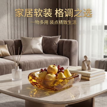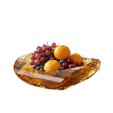 严格还原参考图中琥珀色多面切割水晶果盘的颜色、切割工艺、造型等所有细节,商业级8K超清,专业影棚侧逆光拍摄,突出多面切割的棱线锐利感、光影折射效果与立体结构,居中构图,产品切割面特写,主体占画面85%。添加主标题“匠心切割 光影流转”,大号无衬线烫金字体,居中置顶;添加副标题“多面立体切割工艺 每一面都闪耀”,小号同字体,主标题下方居中。排版采用杂志级极简设计,画面角落添加极小的切割工艺几何示意图,同主色调,不遮挡产品,整体风格现代轻奢,文字格式统一,突出工艺细节。果盘里面放入真实的水果。负面提示词:模糊、噪点、变形、失真、产品细节缺失、切割面模糊、棱线不锐利、光影效果错误、多余元素、阴影、反光、背景杂质、非1:1比例、低分辨率、粗糙质感、割裂感、文字遮挡产品