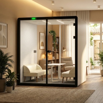 在这个隔音办公舱里添加三个中国年轻人围坐在桌子边聊天,他们穿着日常休闲穿搭,桌子上放有书籍,三个人面上都带有自然的笑容,保持原图整体结构和其他元素不变