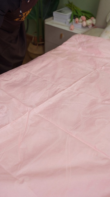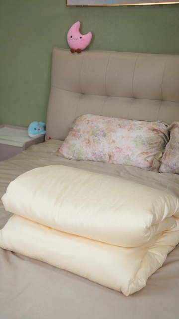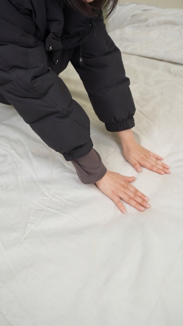 实景感与舒适感交织,柔和光线下的单色床品展现质朴面料纹理,手部细节传递温暖触感,简约设计风营造宁静家居氛围。