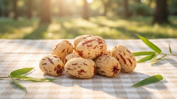 去皮虎皮枣,新鲜采摘,米黄色外皮带有红色纹路,保持物理结构绝对不变,严禁扭曲变形。特写微距拍摄虎皮枣,一颗虎皮枣放在干净冰面上,背景虚化,夏日清爽氛围。冷调清爽自然光,高亮平光,突出虎皮枣新鲜质感。旁边点缀少许溅起的水珠,增加清爽动态感。商业美食摄影,夏日清爽种草风格,极高材质细节,4K分辨率,干净通透。