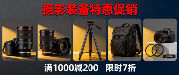 相机装备轮播图,展示相机镜头、三脚架、闪光灯、摄影包等各类摄影配件装备,专业摄影风格,层次感强,专业暗调凸显质感,适合相机店铺宣传,宽950像素高400像素