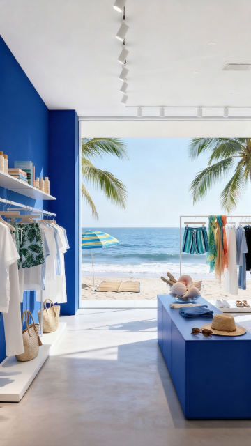 俯视视角,阳光穿透的夏日海滩场景,巨大的立体云朵文字"SUMMER"从碧蓝海水中升起,浪花在字母边缘溅起珍珠般的水珠,三艘载着黄色促销标签的冲浪板从不同角度冲向文字,沙滩上散落着彩色遮阳伞和冰镇饮料杯,远处海平面与渐变蓝的天空相接,整个画面充满动感的波浪线和飞溅的水滴,色调以清爽的天蓝色为主,点缀柠檬黄和珊瑚橙,无任何文字信息。
