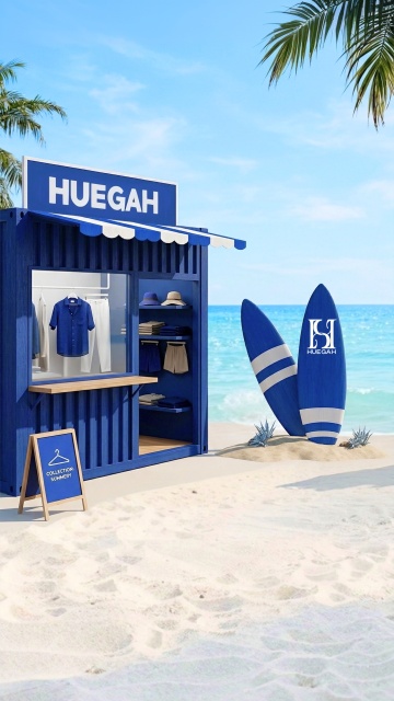 3D微缩艺术风,液态海浪与舒适沙滩,清新色彩营造夏日度假氛围。