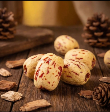 虎皮枣,去掉外皮后露出浅米黄色果肉带红褐色纹理,堆放在白色瓷盘上,保持产品物理结构绝对不变,严禁扭曲变形。主体居中,平稳放在浅原木色砧板上,暖白色莫兰迪背景,拉开景深。室内全屋漫射柔光,通透柔窗光,低对比度,阴影极淡柔和,画面明亮干净,营造温馨治愈感。旁边点缀几片新鲜翠绿薄荷叶,增加生机与食欲。商业高端美食摄影,4K分辨率,极高材质细节,极具食欲,保持画面比例。