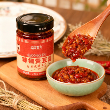 生成类似风格的辣椒黄豆酱美食商业图,保持酱产品和包装本体完全不变,包装形状、结构、图案、文字均不修改,保留酱料原有颜色、颗粒大小、酱豆形态、稠度、光泽不修改,构图类似原图,更换为不同的背景和道具布置,保持暖色调自然光,柔和侧光,红油油润反光,辣椒鲜亮,微距特写,浅景深,浓郁酱香,干净高级,美食商业摄影质感,超有食欲